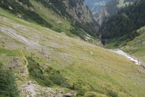 Tras bajar de la cabina, hay que bajar más de 200 escalones de madera hasta llegar al lecho del rio Trift. El sendero para llegar al glaciar empieza en un pequeño puente que advierte del peligro de cruzarlo..Pues el río tiene un caudal variable y a veces hay “riadas espontáneas”..