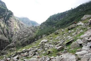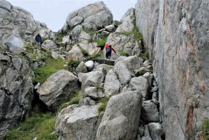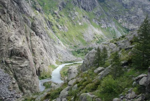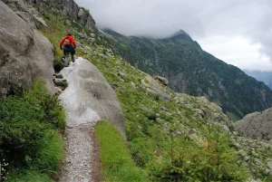 El sendero; siempre ascendente, discurre por el valle del río con un escenario espectacular, cruzamos algún riachuelo y nos ayudamos varias veces, de cadenas que estratégicamente afianzadas, te permitían sortear algún que otro paso dificultoso entre las piedras.