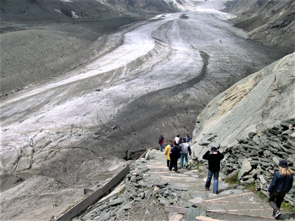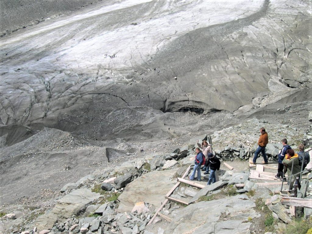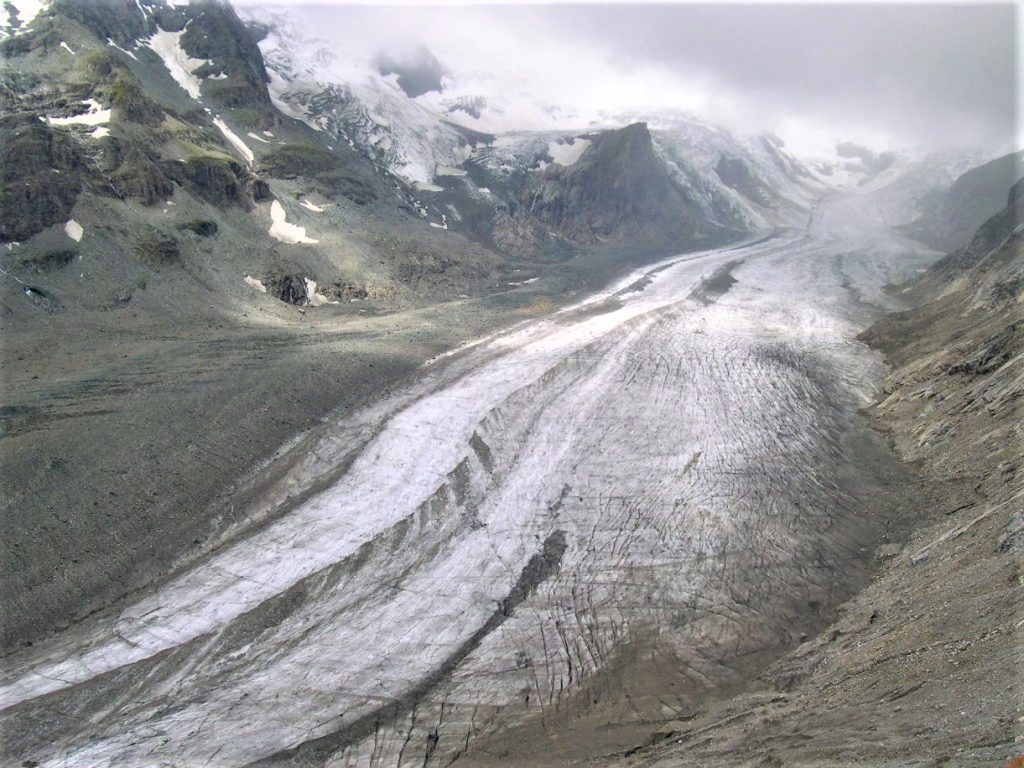 La niebla dificultaba aún la visión del Groosglockner (3800m) que ocultaba su cima, pero dejaba ver el espectáculo del glaciar que se perdía en la lejanía..