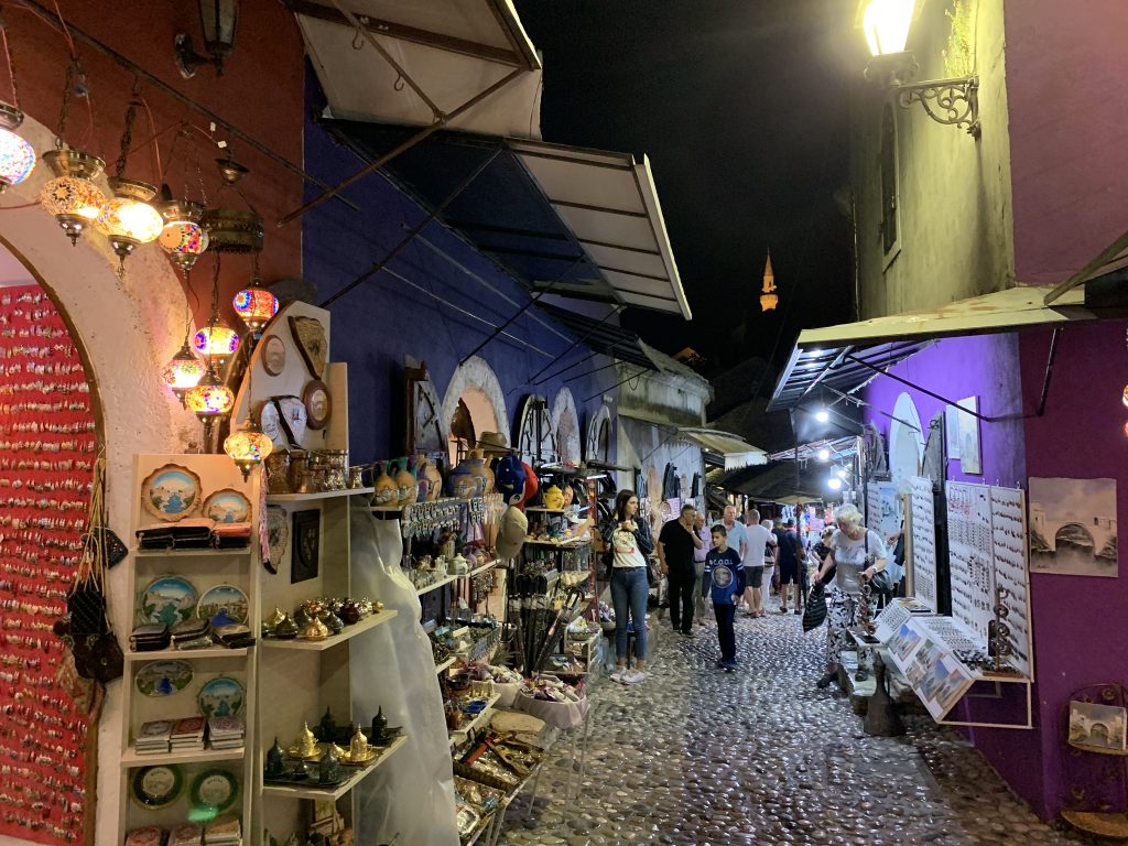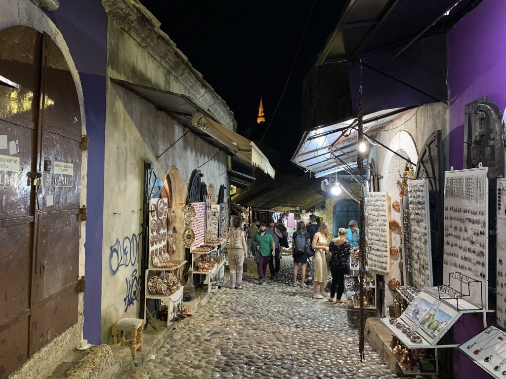Cruzamos el puente provisional realizado por ingenieros militares españoles. Las dos torres que se alzaban en sus extremos, estaban destruidas. Me detuve un rato en mitad del puente para observar las riberas del río con bastante vegetación y algunos locales que a media altura ,parece que se convertirán en futuros restaurantes..La parte musulmana, llamado el bazar de Kujundzilik es una sucesión de locales de artesanía en una zona junto al río y de suelo empedrado.
