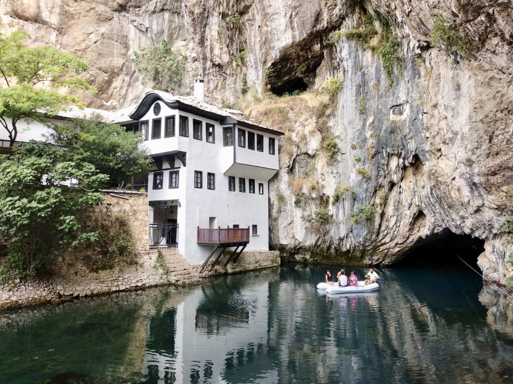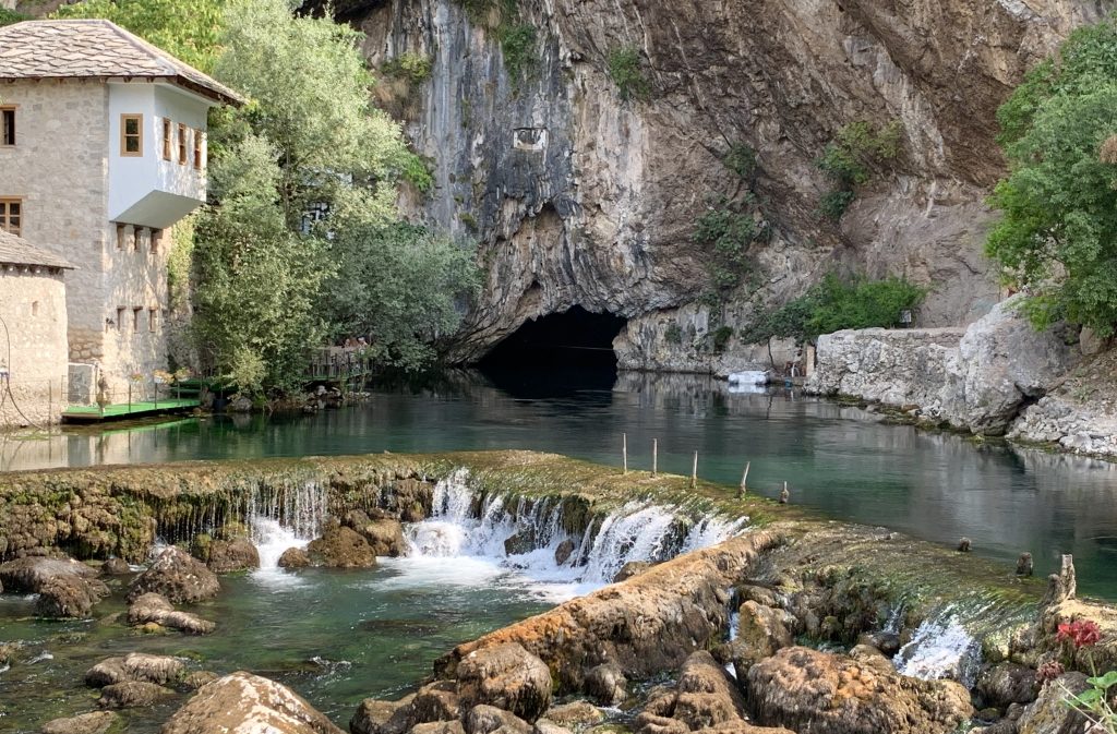 Al día siguiente, nos acercamos a Blagaj, para visitar el desconocido e impresionante monasterio de los Derviches deTekke del S. XV. Está situado en un paraje de cuento, bucólico, rodeado de agua, puentes y molinos y una cueva kárstica donde cae el agua del nacimiento del río Bune.