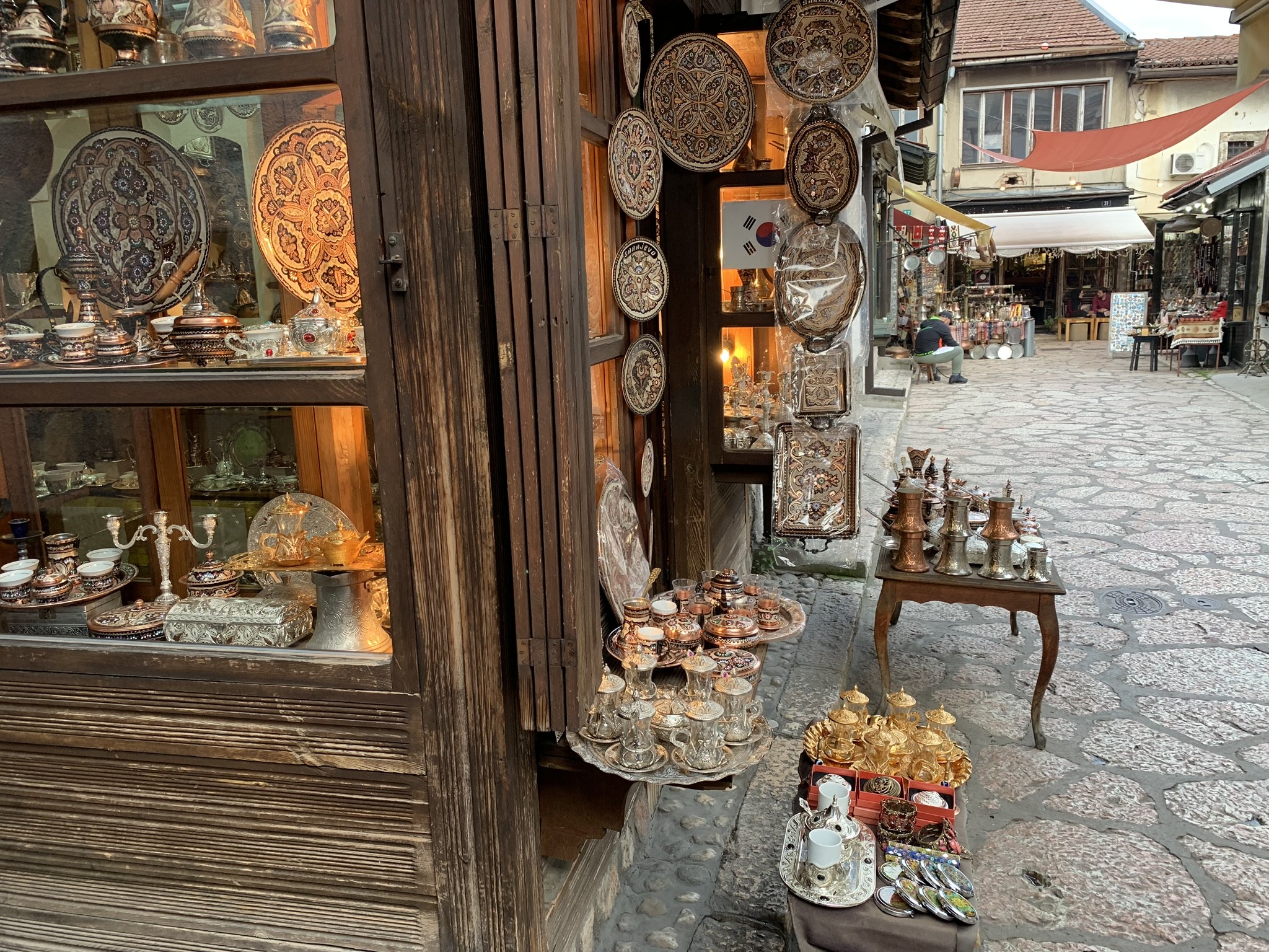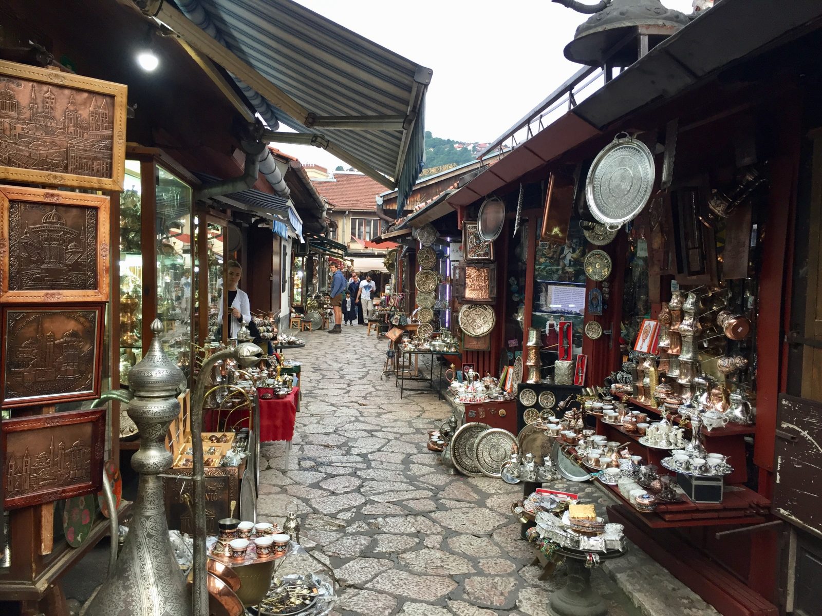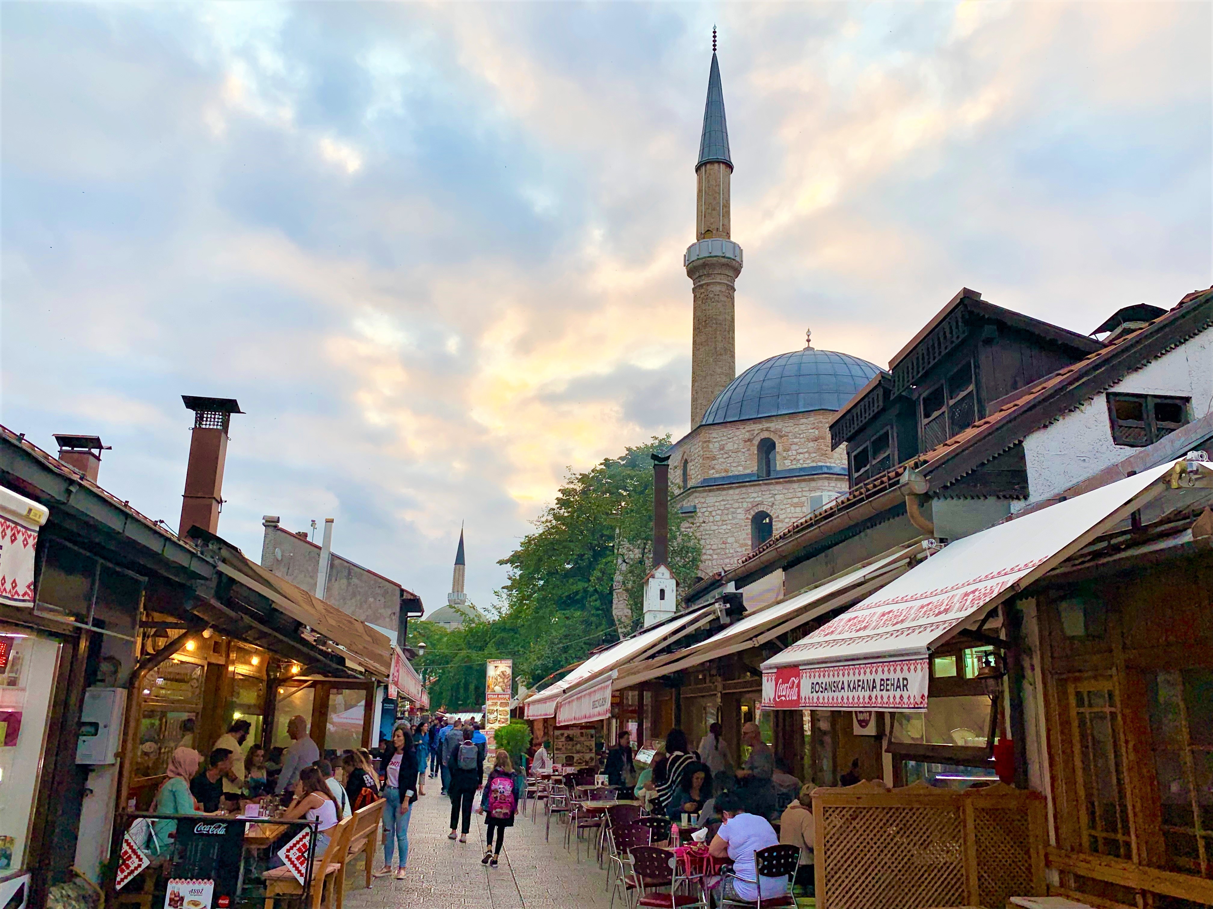 Cerca de la mezquita se encuentra Morica Han. Un Han es una posada situada en los caminos y rutas de las caravanas de mercaderes. Esta posada o Caravasar se construyó en el año 1551 y es la única que aún queda en Sarajevo. Tenía capacidad para 300 personas y 80 caballos. En el recinto, podían alojarse y comer.. Fueron muy concurridos en las grandes rutas de mercaderes durante el período otomano. En la actualidad, alberga varios comercios, varias asociaciones religiosas y un agradable restaurante de comida Bosnia..Decidimos comer allí acomodados en el espacioso patio y saboreamos un Burek de origen turco muy sabroso. El Burek es un hojaldre relleno de carne y queso. A continuación nos ofrecieron una especie de albóndigas de carne de cordero en salsa de ajos (Klepe) y de postre el famoso Baklava, elaborado con varias capas de pasta filo y relleno de pistachos y nueces bañadas en miel.. la comida Bosnia; en general, nos pareció muy sabrosa y apetecible!..