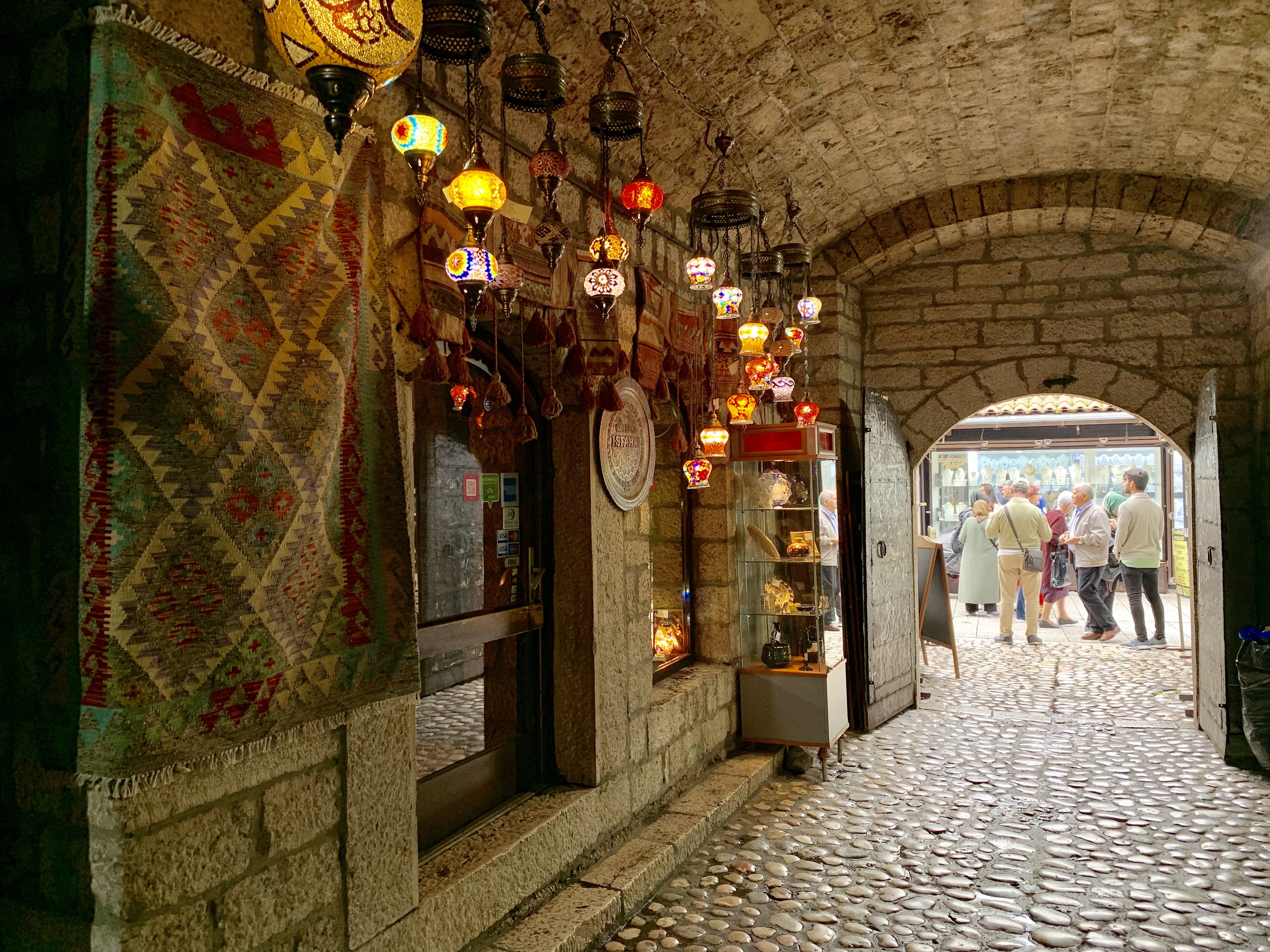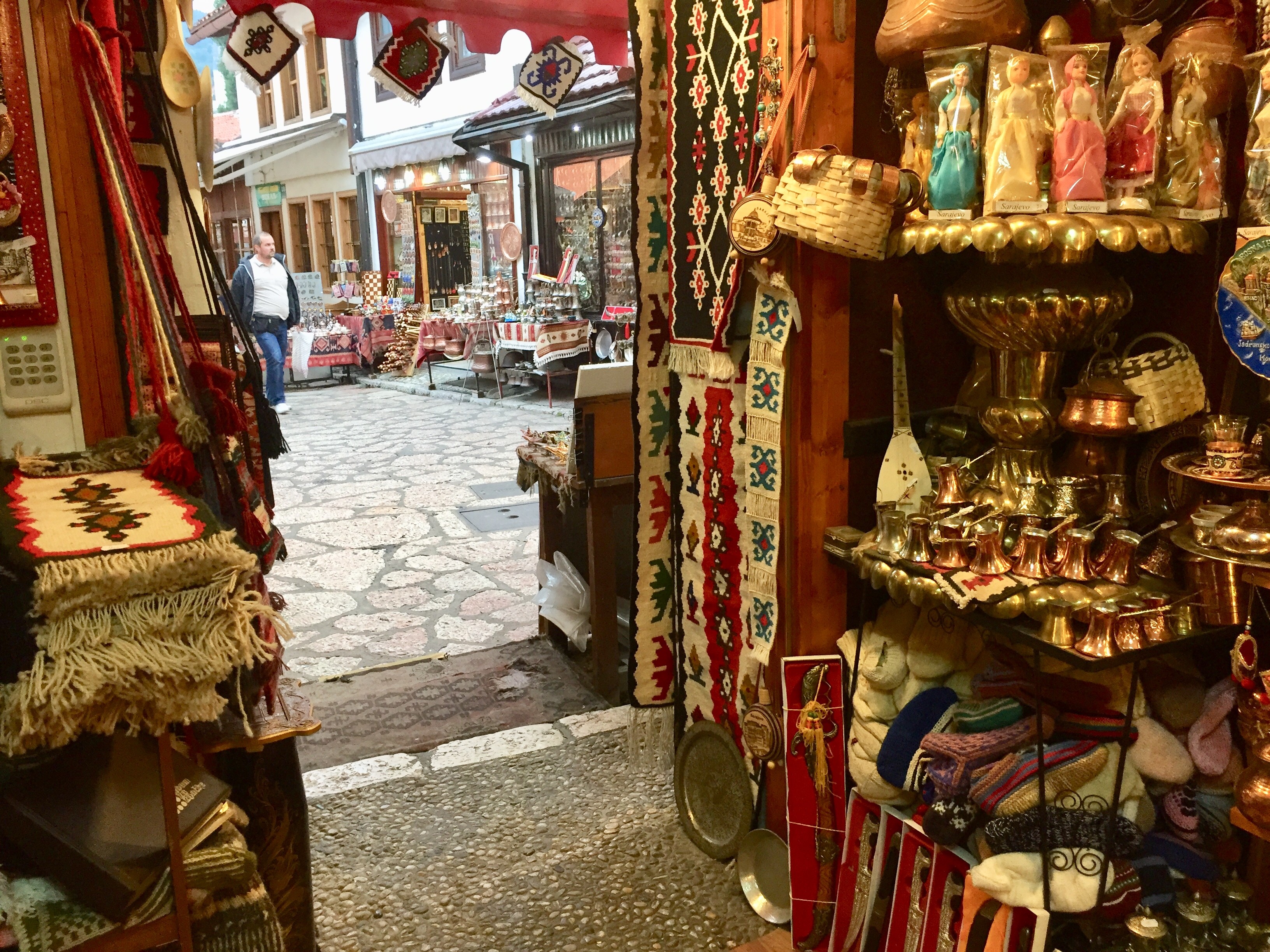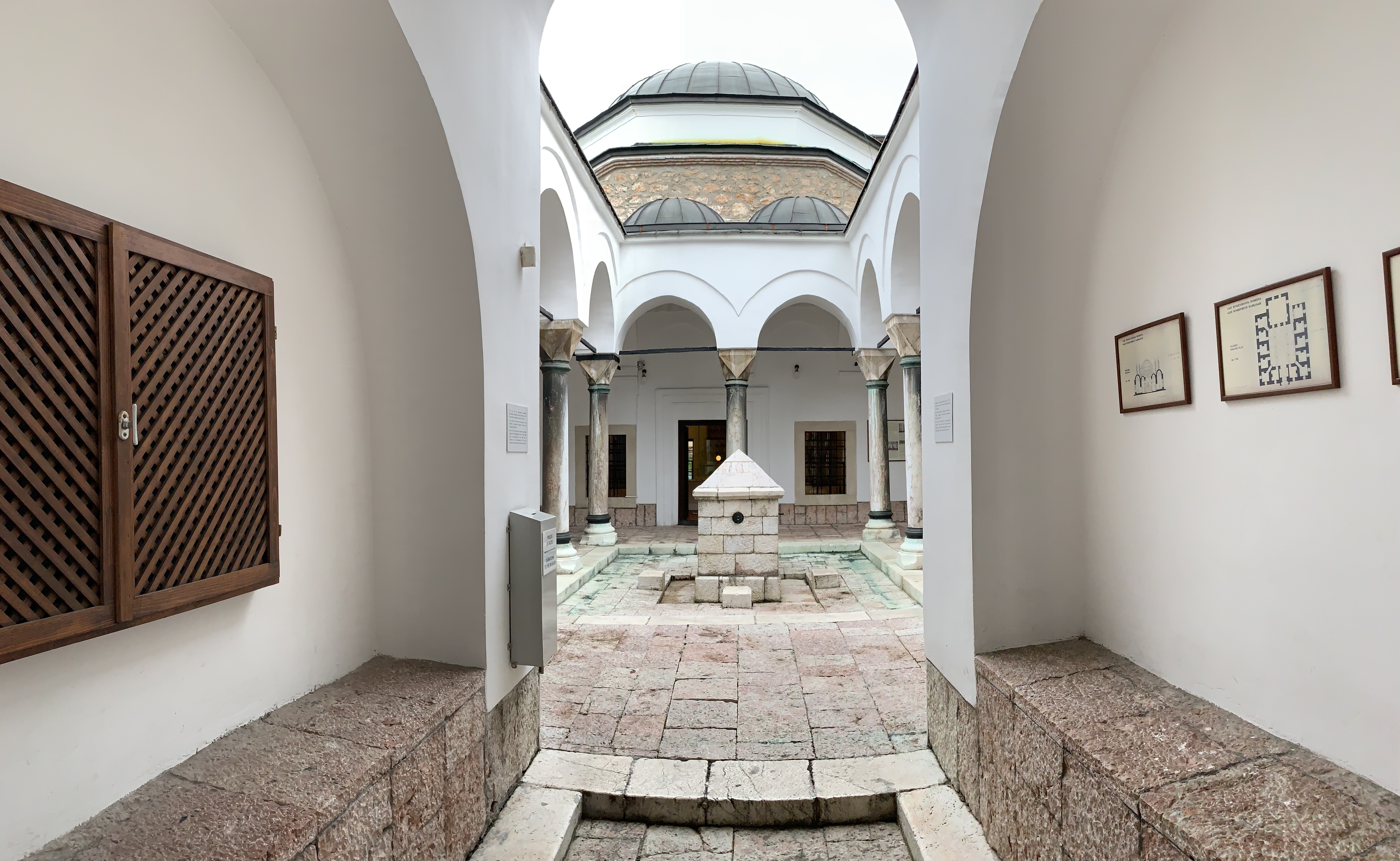 Cerca de la mezquita se encuentra Morica Han. Un Han es una posada situada en los caminos y rutas de las caravanas de mercaderes. Esta posada o Caravasar se construyó en el año 1551 y es la única que aún queda en Sarajevo. Tenía capacidad para 300 personas y 80 caballos. En el recinto, podían alojarse y comer.. Fueron muy concurridos en las grandes rutas de mercaderes durante el período otomano. En la actualidad, alberga varios comercios, varias asociaciones religiosas y un agradable restaurante de comida Bosnia..Decidimos comer allí acomodados en el espacioso patio y saboreamos un Burek de origen turco muy sabroso. El Burek es un hojaldre relleno de carne y queso. A continuación nos ofrecieron una especie de albóndigas de carne de cordero en salsa de ajos (Klepe) y de postre el famoso Baklava, elaborado con varias capas de pasta filo y relleno de pistachos y nueces bañadas en miel.. la comida Bosnia; en general, nos pareció muy sabrosa y apetecible!..