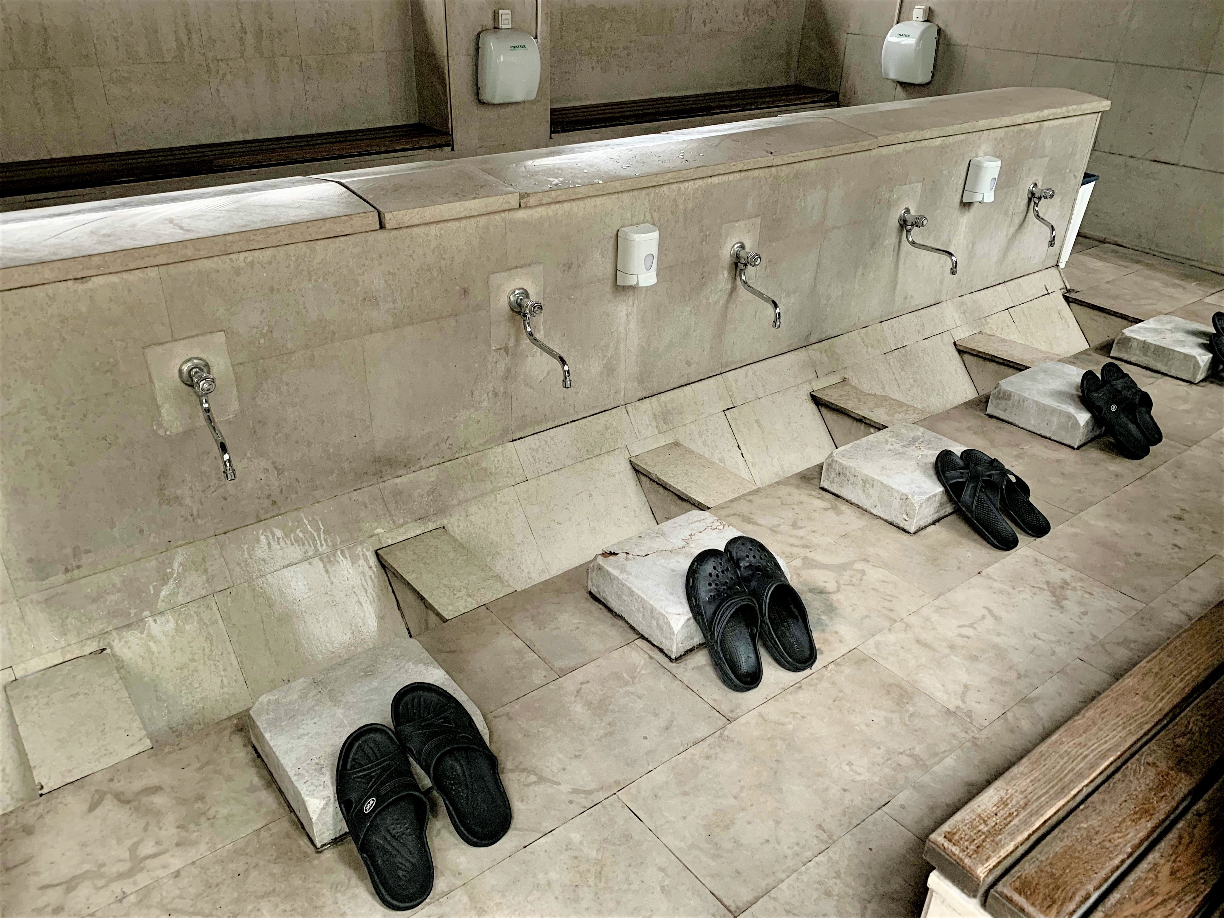 En el centro del patio, destaca la bella fuente de las abluciones de Shadirvan. Este tipo de fuente con templete y cúpula es de origen Persa y es frecuente su presencia en mezquitas, caravasares y en madrasas..