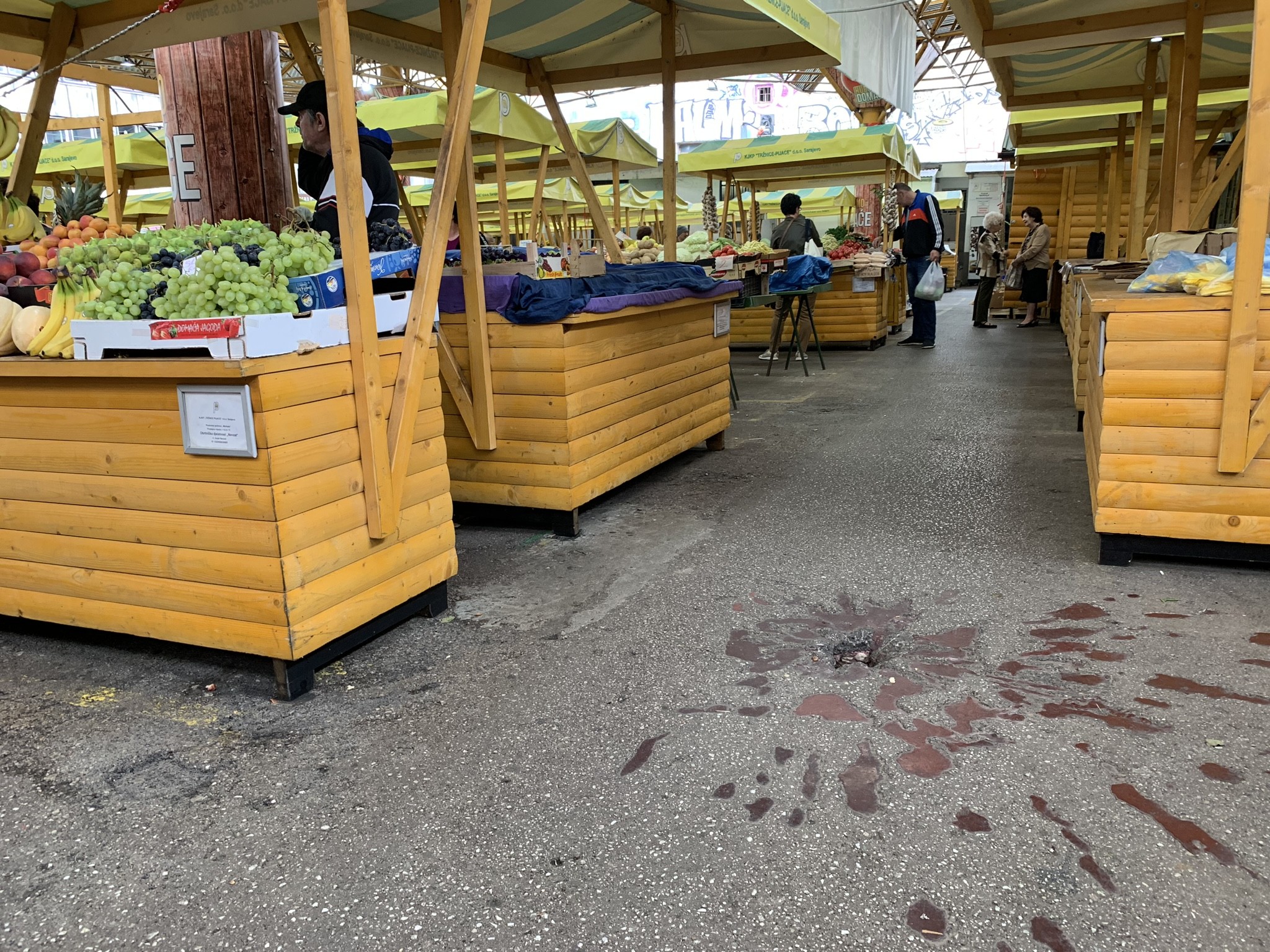 Al día siguiente visitamos la catedral del Sagrado Corazón. Esta iglesia es el centro del catolicismo en Bosnia y está situada en una zona donde abundan las sinagogas y mezquitas, como símbolo de la convivencia religiosa que ha existido en la ciudad..Tras visitar la catedral, nos acercamos hasta el Green Market, en el centro de Sarajevo. Este mercado fue celebre por dos ataques con morteros que segaron la vida; durante el cerco de Sarajevo, a 111 personas inocentes a manos de los militares pro-serbios. El primer ataque ocurrió el 5 de febrero de 1994 y mató a 68 personas. El segundo ataque se produjo el 28 de agosto de 1995 y terminó con la vida de 43 ciudadanos. Este hecho, provocó la intervención de la Otan contra las posiciones paramilitares Serbio-Bosnias y aceleró la firma de los acuerdos de Dayton.. Hoy en una de las esquinas del mercado; en el suelo, se observa el impacto de las bombas que ha sido rellenado de resina roja, como recuerdo de tan brutal ataque…