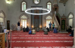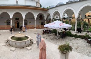 Dejamos la ribera del río y caminamos hasta la plaza del Mariscal Tito. Muy cerca, se halla la mezquita de Ali Pasha, también de la época otomana del S. XVI. Entramos al patio rodeado de columnas y arcadas y con una bella fuente de abluciones en el centro. Desde el patio se observan las tres cúpulas que cubren los claustros y la cúpula que cubre la zona de oración, bastante más grande. Entramos en la zona de oración, bellamente decorada con extensas alfombras y con una enorme lámpara circular en el centro. Varios hombres, oraban sentados en la alfombra y dejaban escuchar el susurro de sus plegarias..
