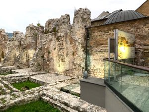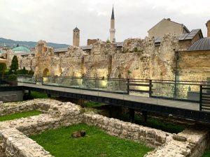 Antes del atardecer, visitamos los jardines del hotel Europa. En los terrenos anexos al hotel, se encuentran los restos del Caravasar o Posada de piedra de Han (Taslihan), del S. XVI, uno de los tres albergues que existieron en Sarajevo en la época otomana. Este caravasar, estuvo activo hasta el año 1879.. Un gran incendio lo destruyó por completo..