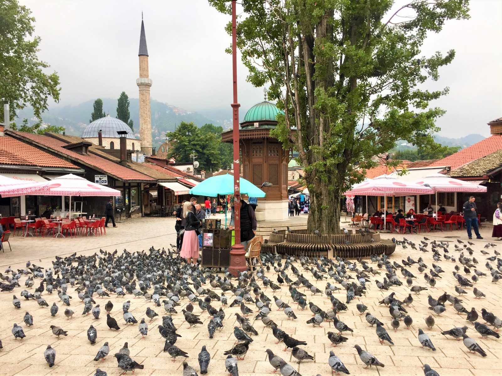 Llegamos a Sarajevo al atardecer..Nos dirigimos hacia el barrio de Bascarsija o barrio turco, construido por el imperio Otomano en el S. XV. Sus calles empedradas y retorcidas forman el antiguo bazar que conserva todos los rasgos desde hace siglos. En el centro de la plaza de Bascarsija se encuentra la bella fuente pública de Sebilj, construida en 1753 por el Pasha Kukavica en piedra y madera. La fuente, siempre está rodeada de palomas que pululan por su alrededor a la espera del viajero que les obsequie algo de comida..Alrededor de la plaza se extiende el antiguo bazar con sus características tiendas, y restaurantes diseminados alrededor de la plaza..