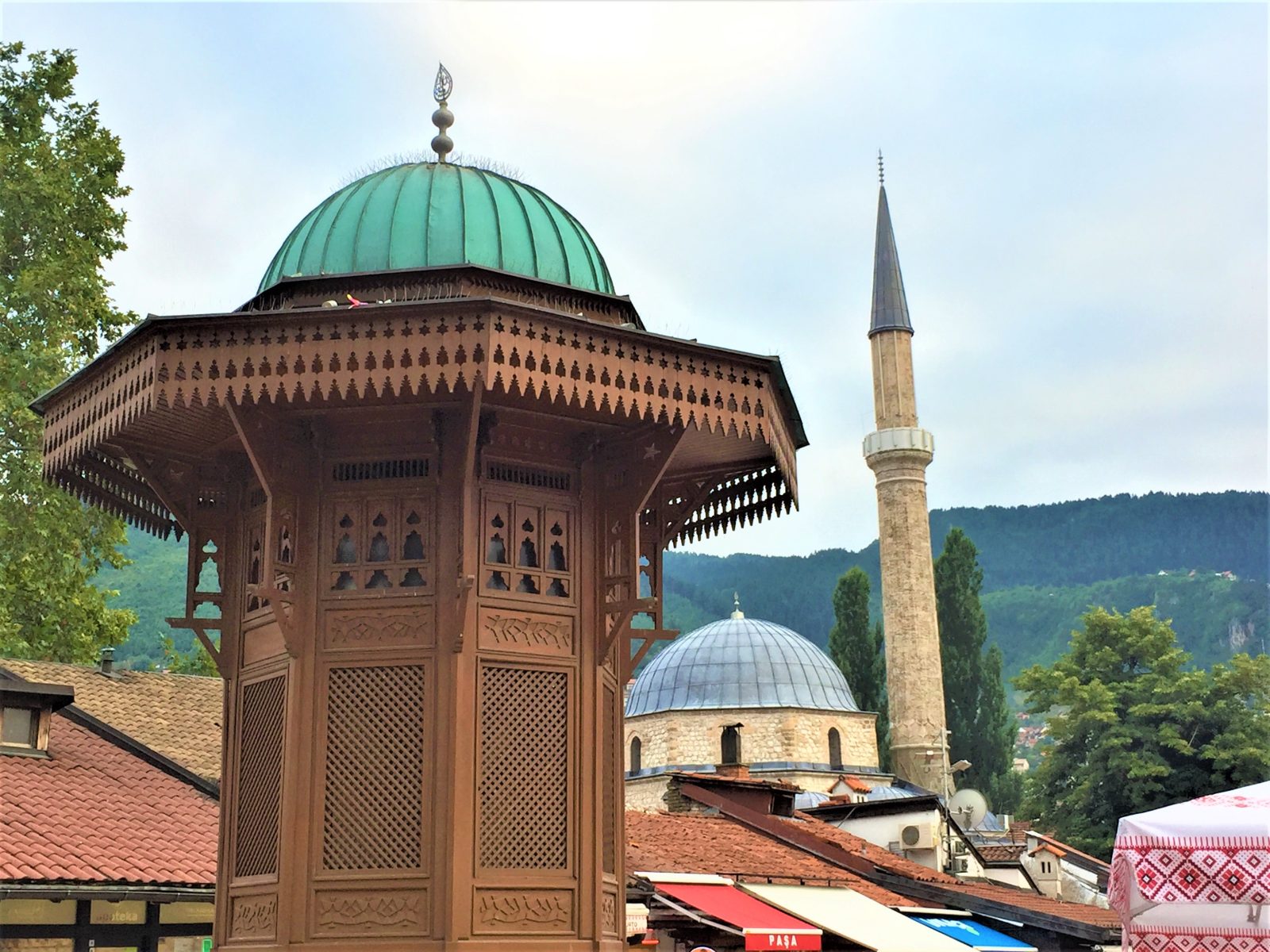 Muy cerca de la fuente de Sebilj destaca la mezquita de Gazi Husrev, de estilo otomano y construida en el S, XVI. Es la más monumental de Bosnia y Herzegovina y junto a su enorme cúpula, se eleva un único y airoso minarete. Su visita; posible en las horas que no hay oración, es visita obligada en Sarajevo. Un lugareño en un perfecto castellano, nos indicó; entre otras curiosidades, que fue la primera mezquita que recibió luz eléctrica en el año 1898..